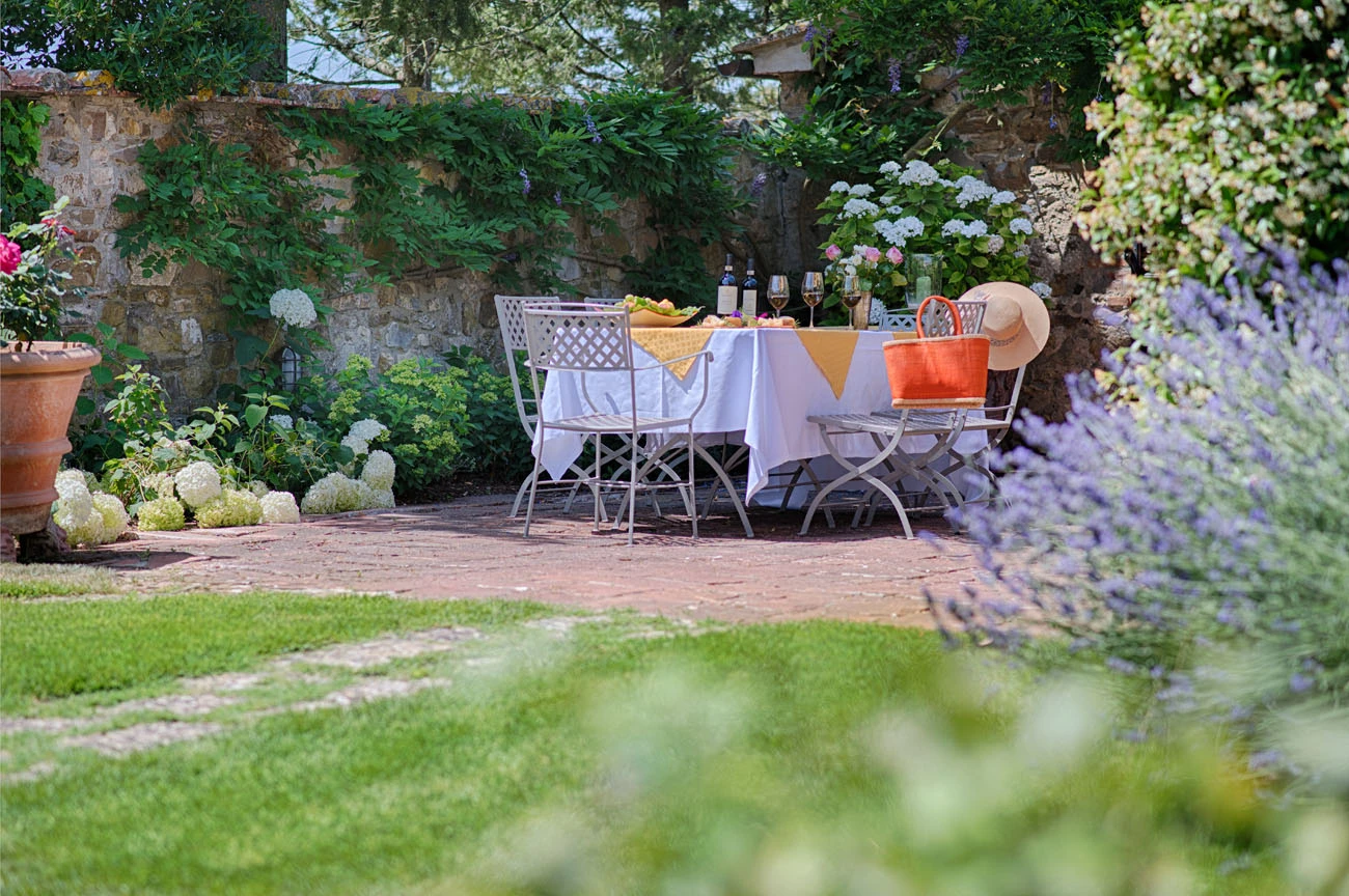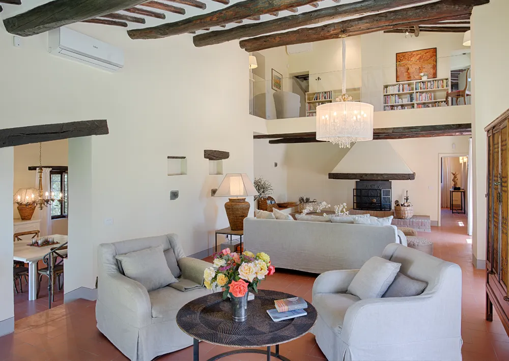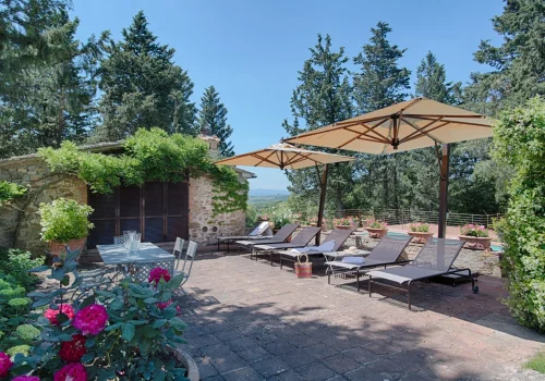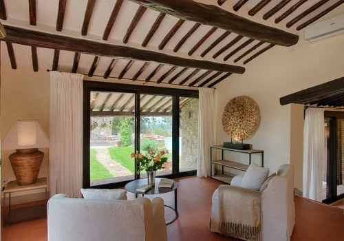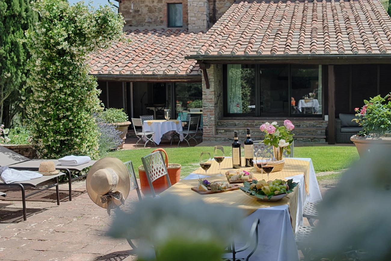 Die Innenräume sind großzügig, hell und geschmackvoll eingerichtet. Im Außenbereich erwarten Sie gepflegte Gärten und Ausblicke auf die historischen Terrassen des Weinbergs Antico Podere Gagliole, perfekt um sich zu entspannen und die Stille zu genießen.
