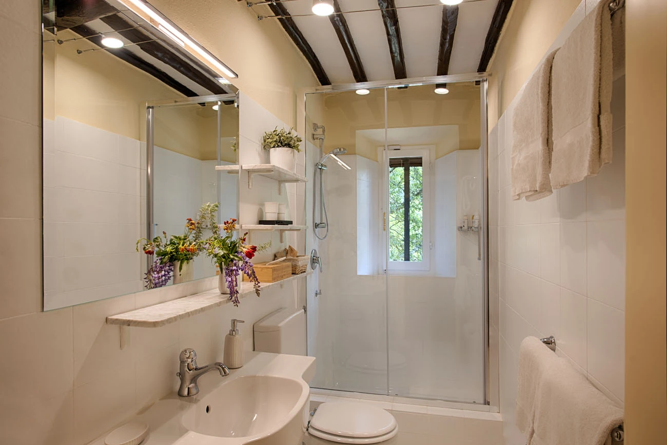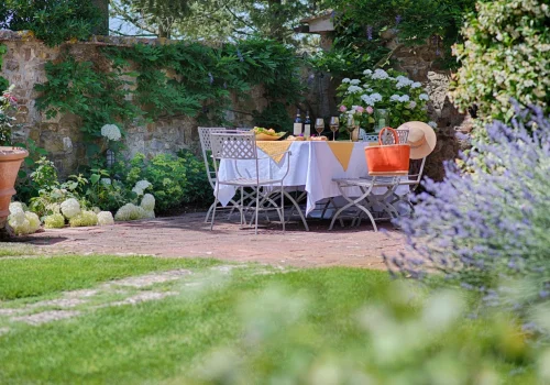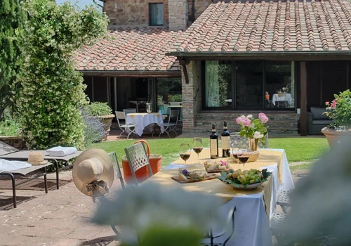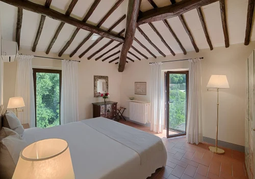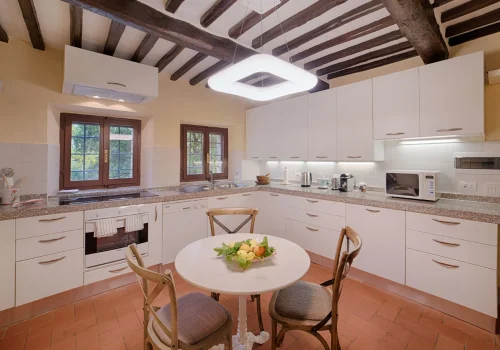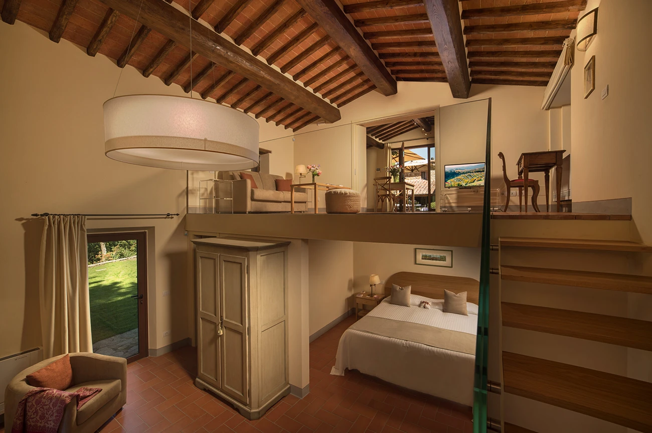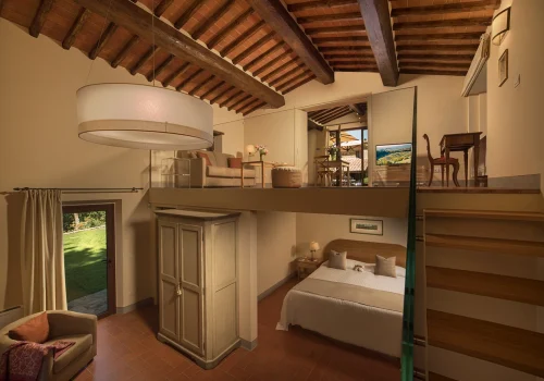 Die Innenräume sind großzügig, hell und geschmackvoll eingerichtet. Im Außenbereich erwarten Sie gepflegte Gärten und Ausblicke auf die historischen Terrassen des Weinbergs Antico Podere Gagliole, perfekt um sich zu entspannen und die Stille zu genießen.