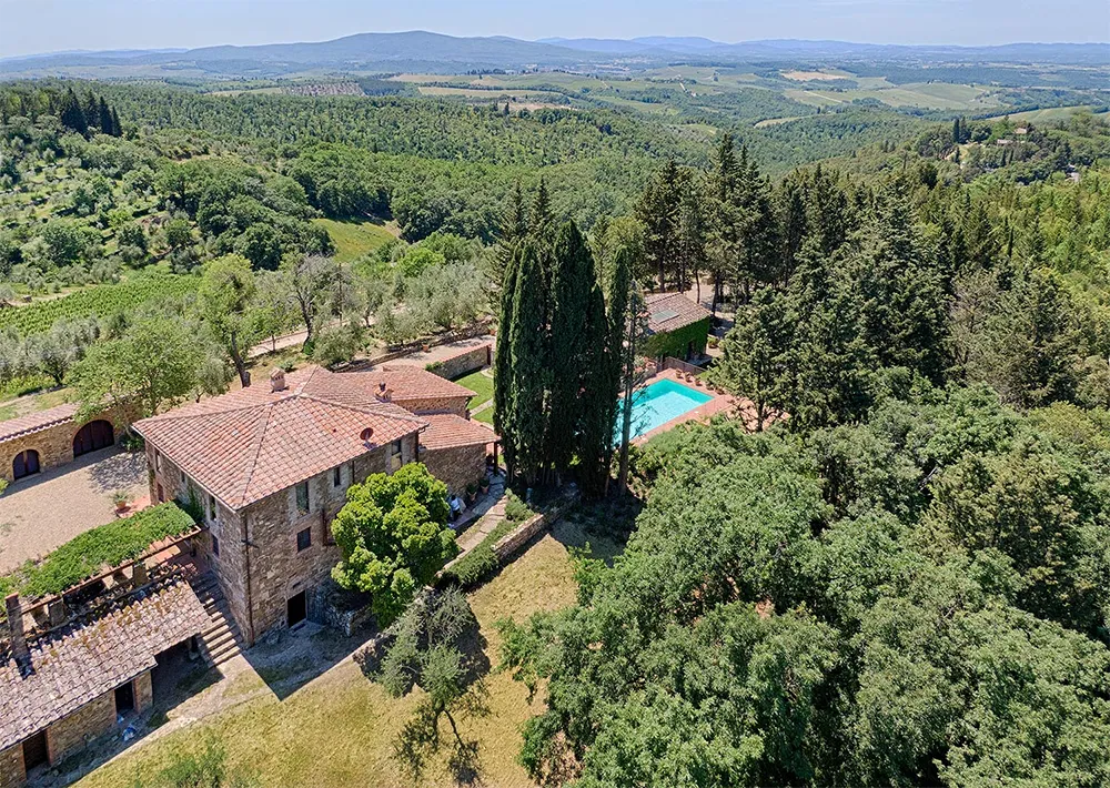 Zwischen Eichen und Steineichen führt eine abgelegene Straße zur Villa, an einen Ort, an dem der authentische Klang der Natur Teil des Erlebnisses wird. Von hier aus öffnet sich der Blick auf das Val d’Elsa, während Dörfer wie Radda, Gaiole, Panzano und Greve ebenso wie Florenz und Siena nur wenige Kilometer entfernt liegen.
